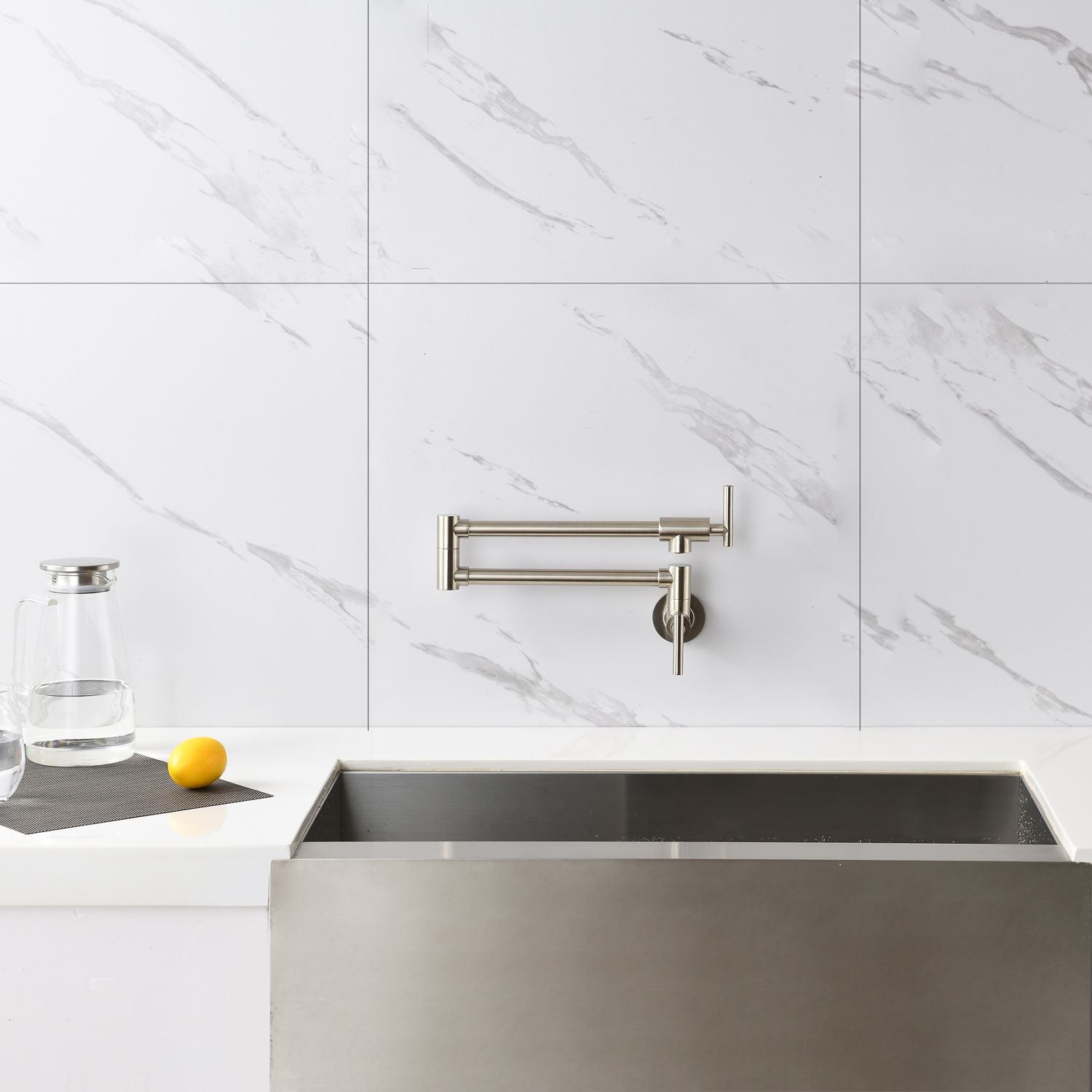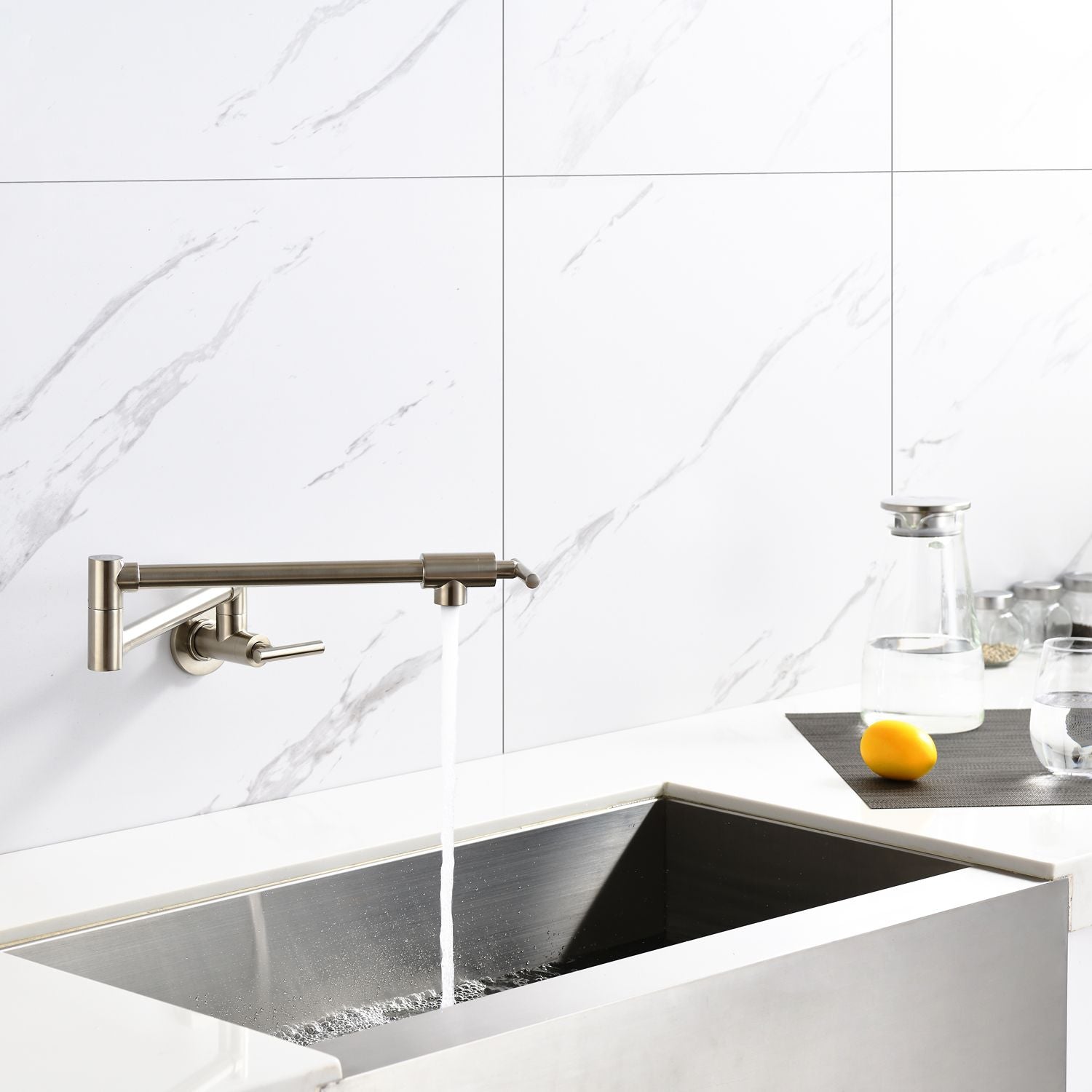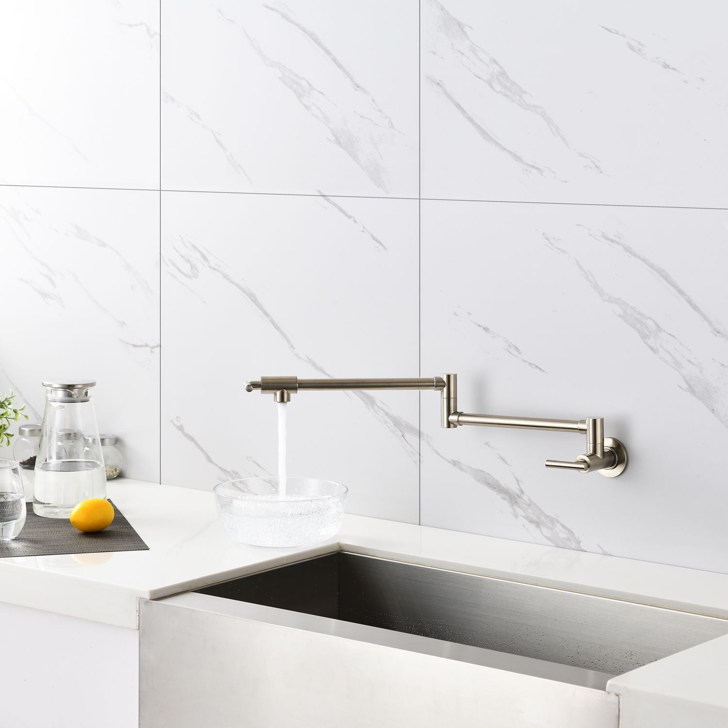 The pot filler faucet features a free-swivel arm design, making it easier to fill any pot on the stovetop and for easier cleaning.
